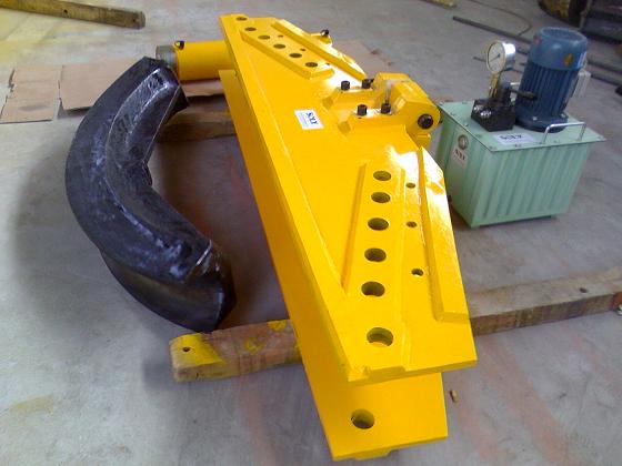 由電動(dòng)油泵(10),高壓油管(12),快速接頭(13),工作油缸(8),柱塞(7),彎管部件[包括上花板(3),下花板(14),模頭(4),輥軸(2)]組成。由電動(dòng)油泵輸出的高壓油,經(jīng)高壓油管送入工作油缸內(nèi),高壓油推動(dòng)工作油缸內(nèi)柱塞,產(chǎn)生推力,通過彎管部件彎曲管子 。